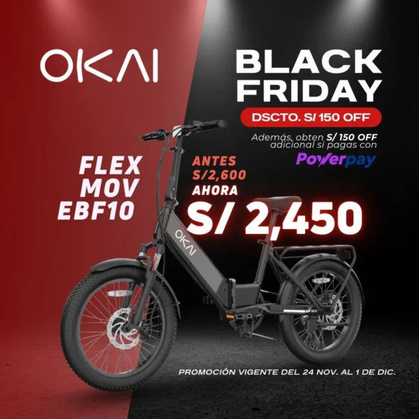 Aprovecha nuestros precios de asalto. El OKAI EBF10 FlexMov es una e-bike plegable y robusta para ciudad y paseos mixtos: combina un motor de 350 W (pico 672 W) con batería extraíble de 48V 10,4Ah, logrando hasta 95 km de autonomía y una velocidad máx. de 32 km/h. Rueda con seguridad gracias a sus neumáticos 20×3″, frenos de disco y suspensión delantera. Pesa cerca de 27 kg, soporta hasta 120 kg y se pliega a un tamaño compacto para llevar en auto o guardarlo en espacios reducidos. Ideal para quienes buscan comodidad, versatilidad y portabilidad en el día a día. Disponible en color negro y verde.